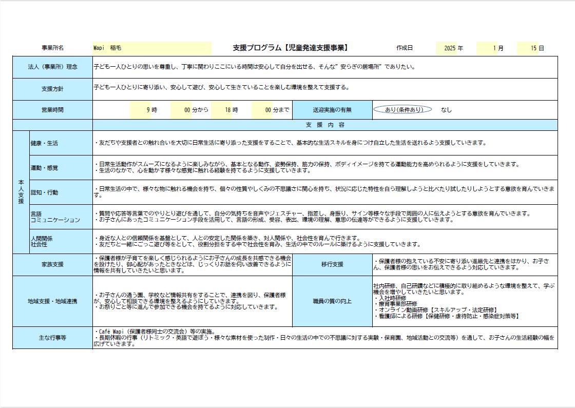 Wapi稲毛の支援プログラム(児童発達支援事業分)を公開します。